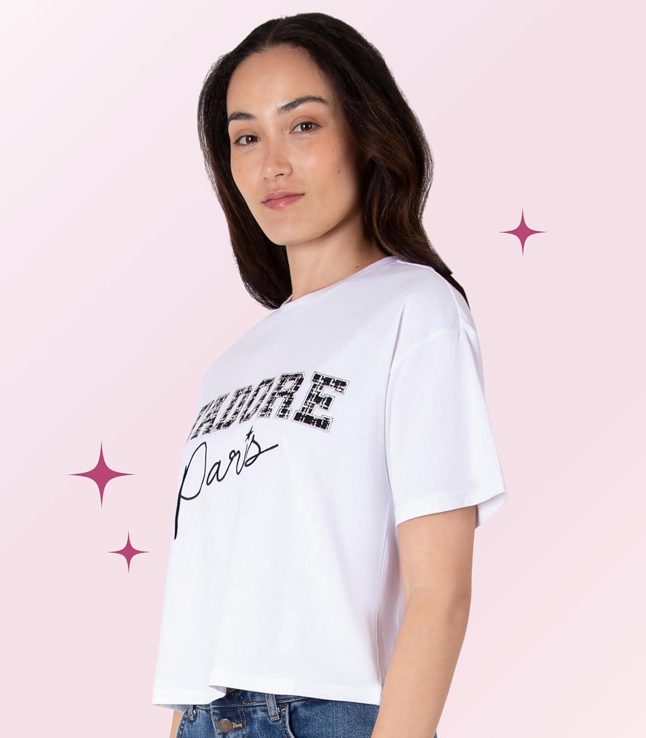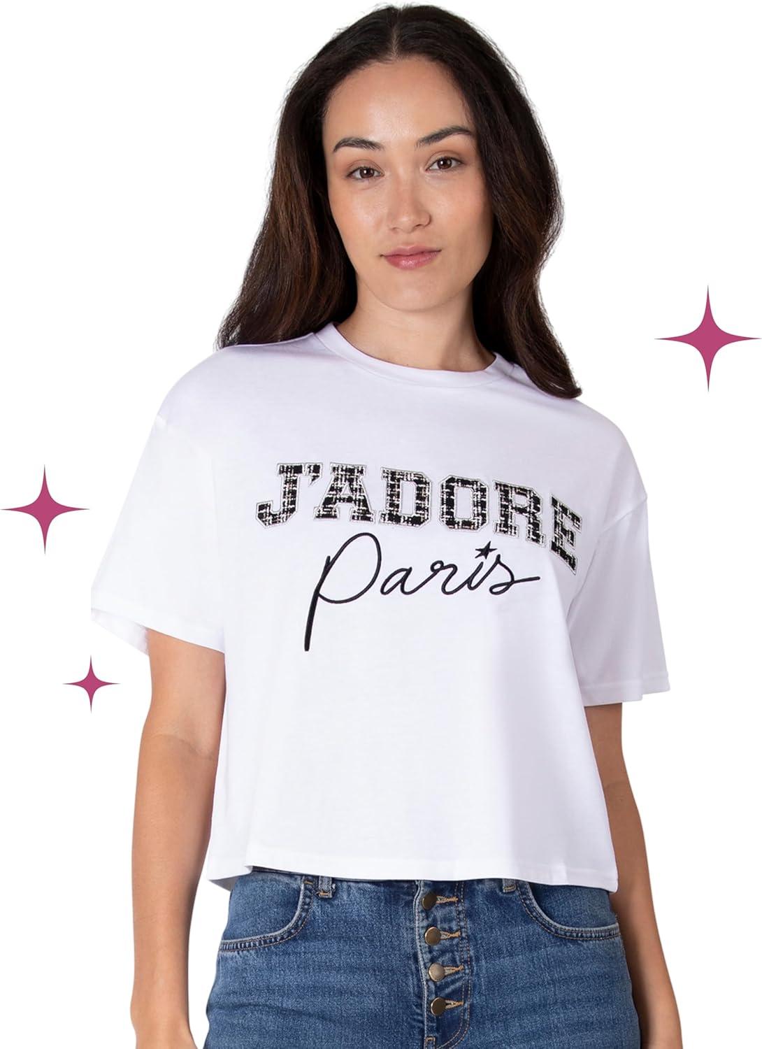 Paris Hilton Women’s Fashion T-Shirt Embellished Graphics Short Sleeve Crew Neck Tops(Jadore White)