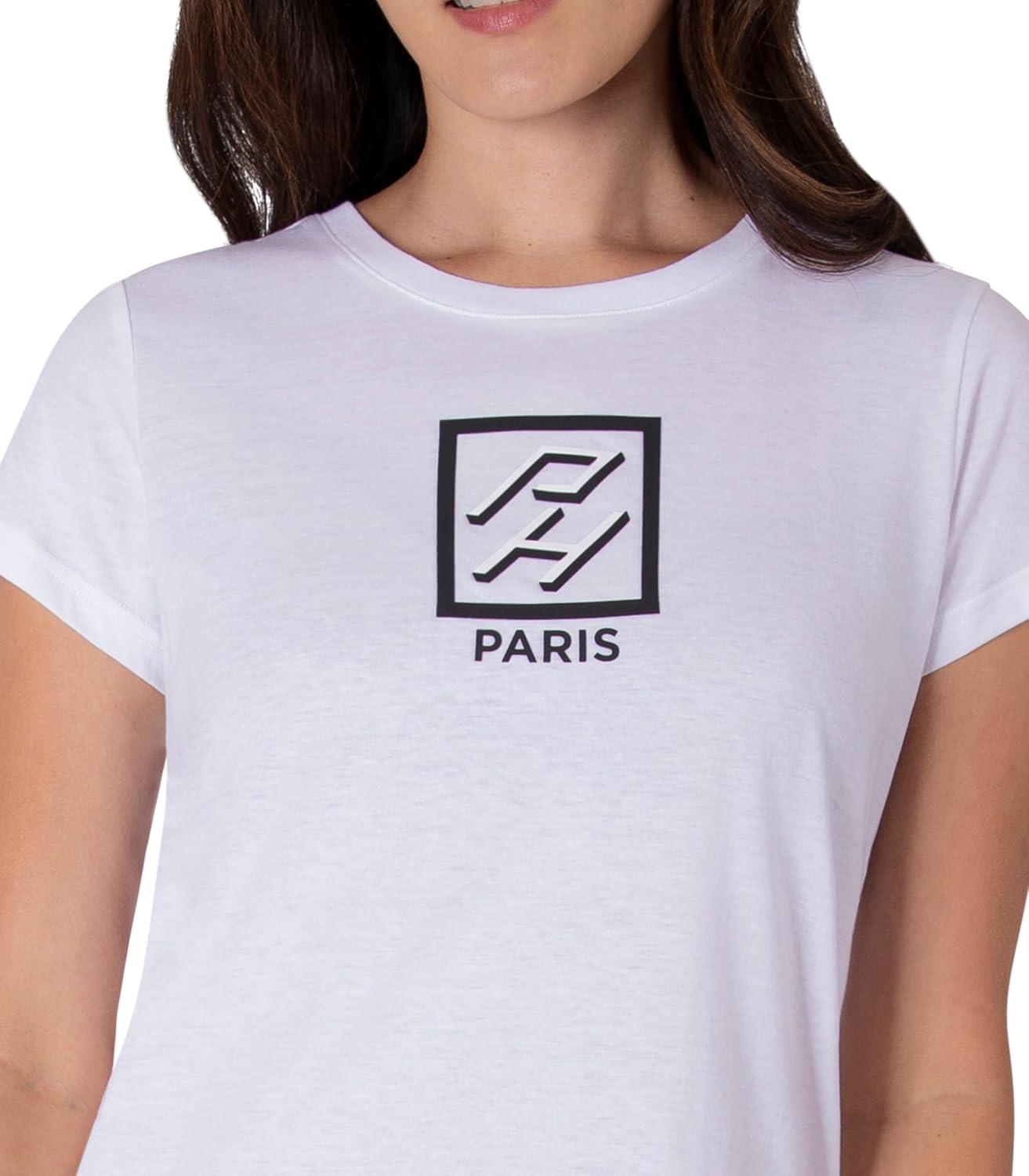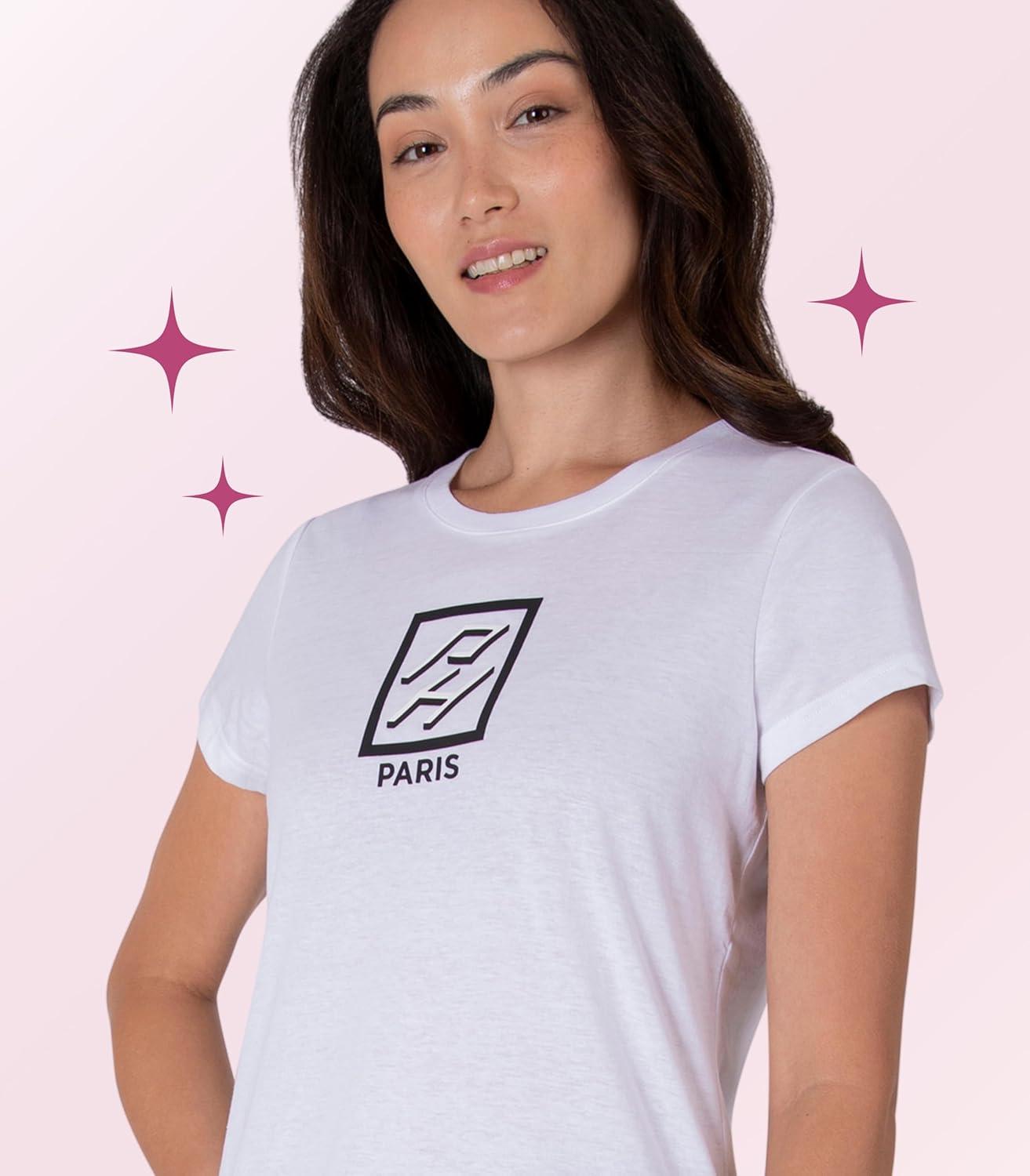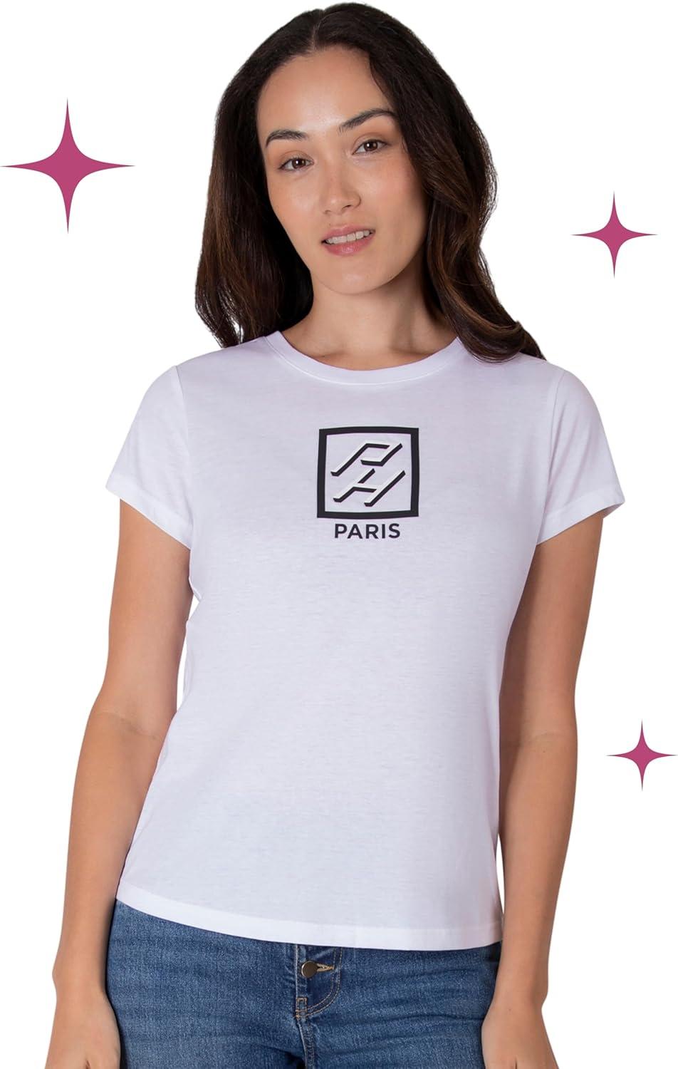 Paris Hilton Women’s Fashion T-Shirt Embellished Graphics Short Sleeve Crew Neck Tops(White Iconic)