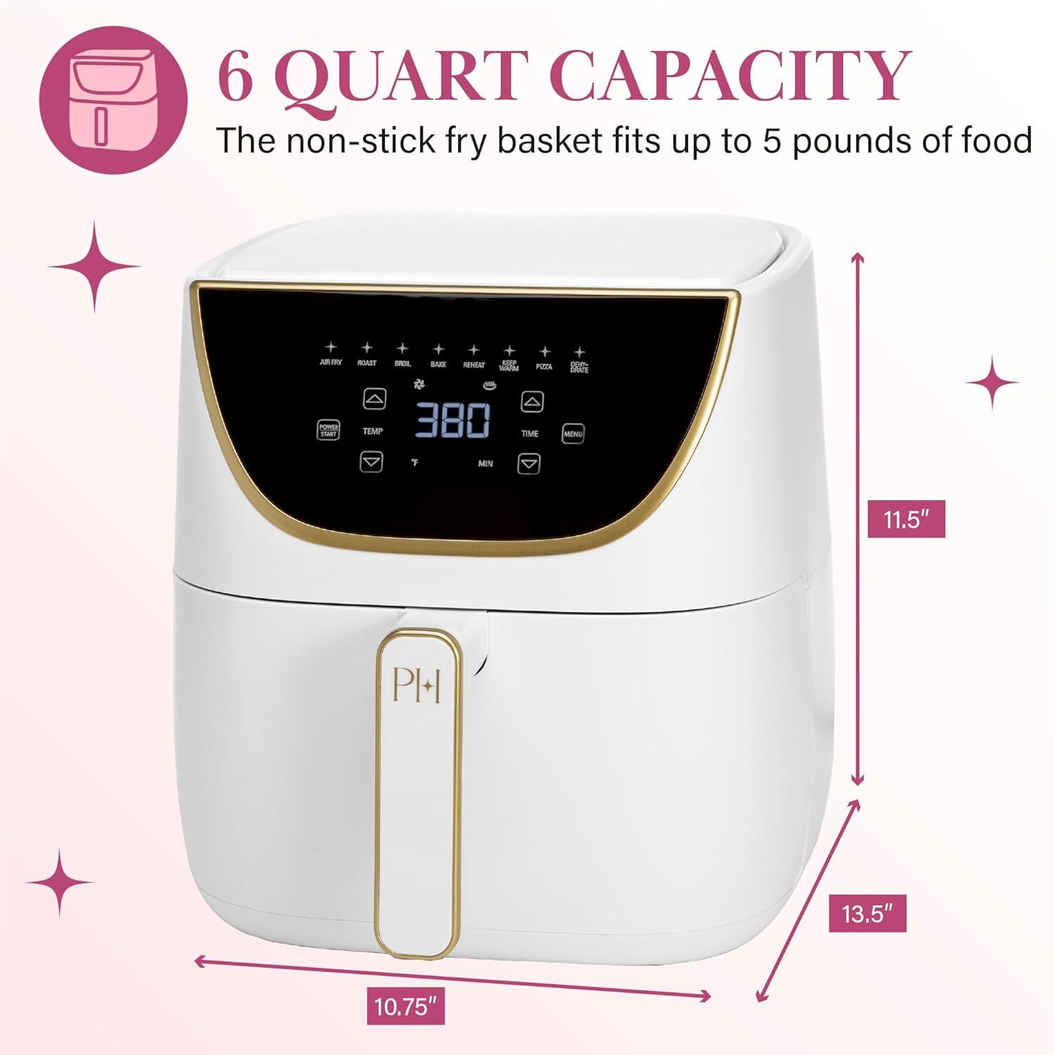 Paris Hilton Air Fryer, Large 6-Quart Capacity, Nonstick Made without PFAS, Touchscreen Display, 8-in-1 (Air Fry, Roast, Broil, Bake, Reheat, Keep Warm, Pizza, Dehydrate), Dishwasher Safe, White(White)