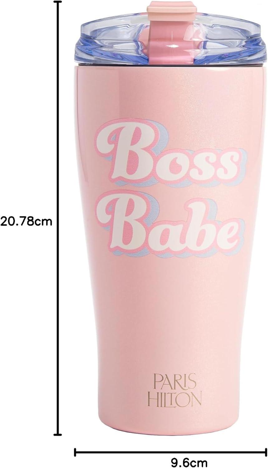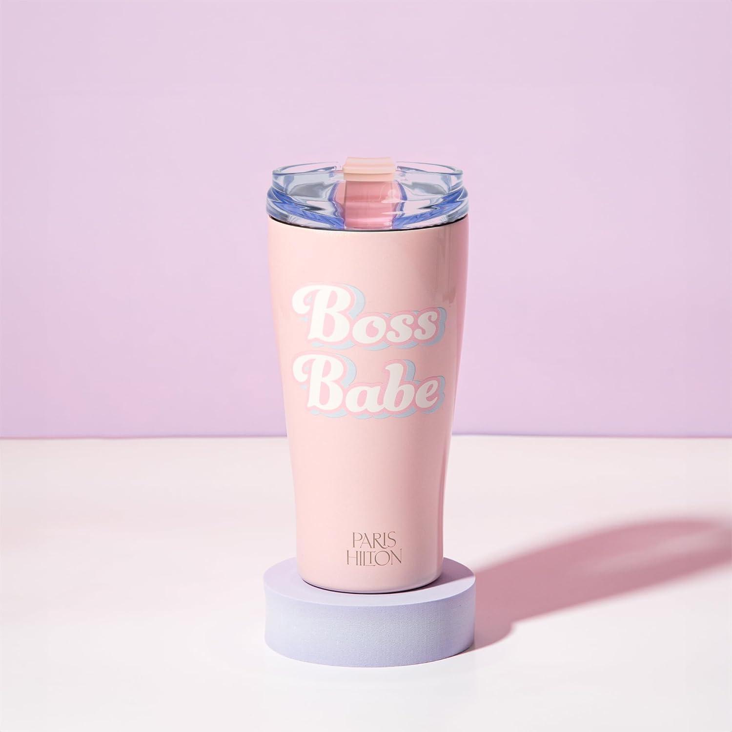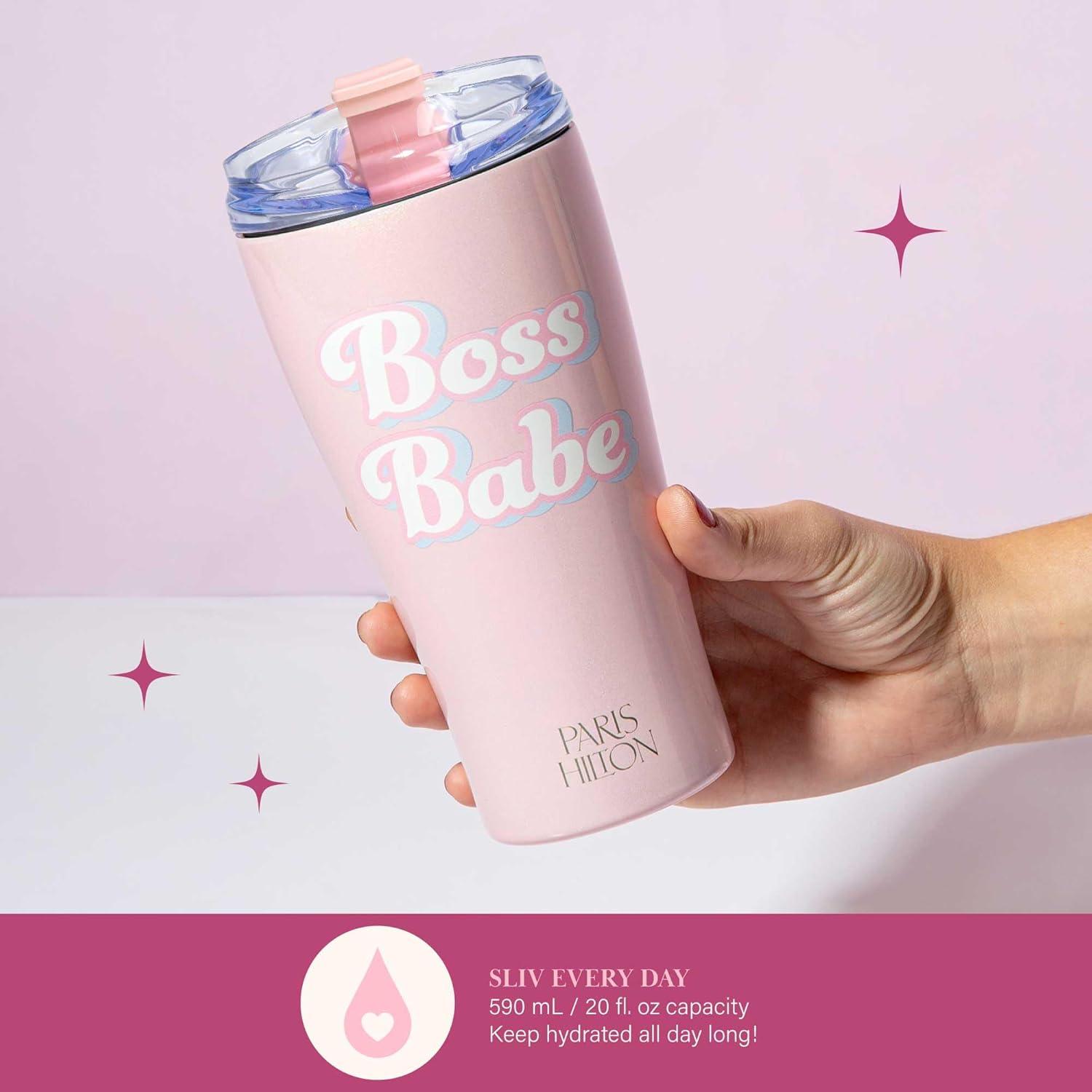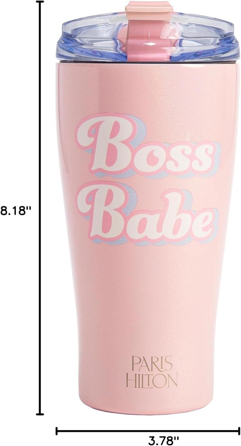 Quench your thirst in sparkling style with the Paris Hilton 20-Ounce Boss Babe Tumbler. This iridescent stainless steel travel cup glitters with an eye-catching design that steals the show wherever you go. The insulated double-wall vacuum construction keeps drinks icy cold for up to 24 hours or hot for 8 hours; perfect for water, smoothies, coffee and more. An easy flip-top lid is leak-proof when in the closed position to prevent spills so you can sip in style on the go. This 20-ounce tumbler fits in most car cup holders while its wide mouth makes adding ice cubes and cleaning a breeze. An epic gift for birthdays, brides and holidays, this glam tumbler helps you shine bright while staying hydrated. Strut in confidence with this stylish stainless steel tumbler!
