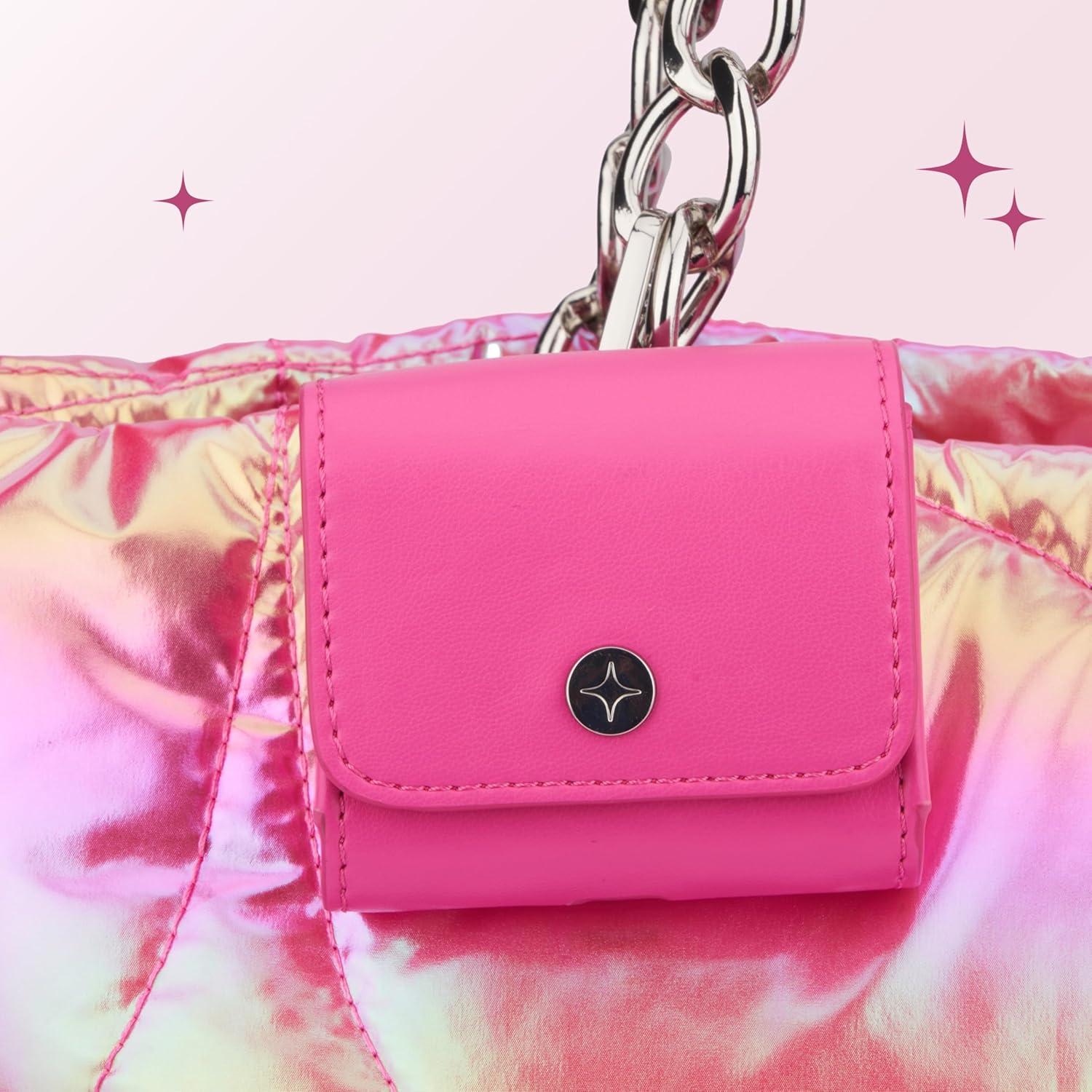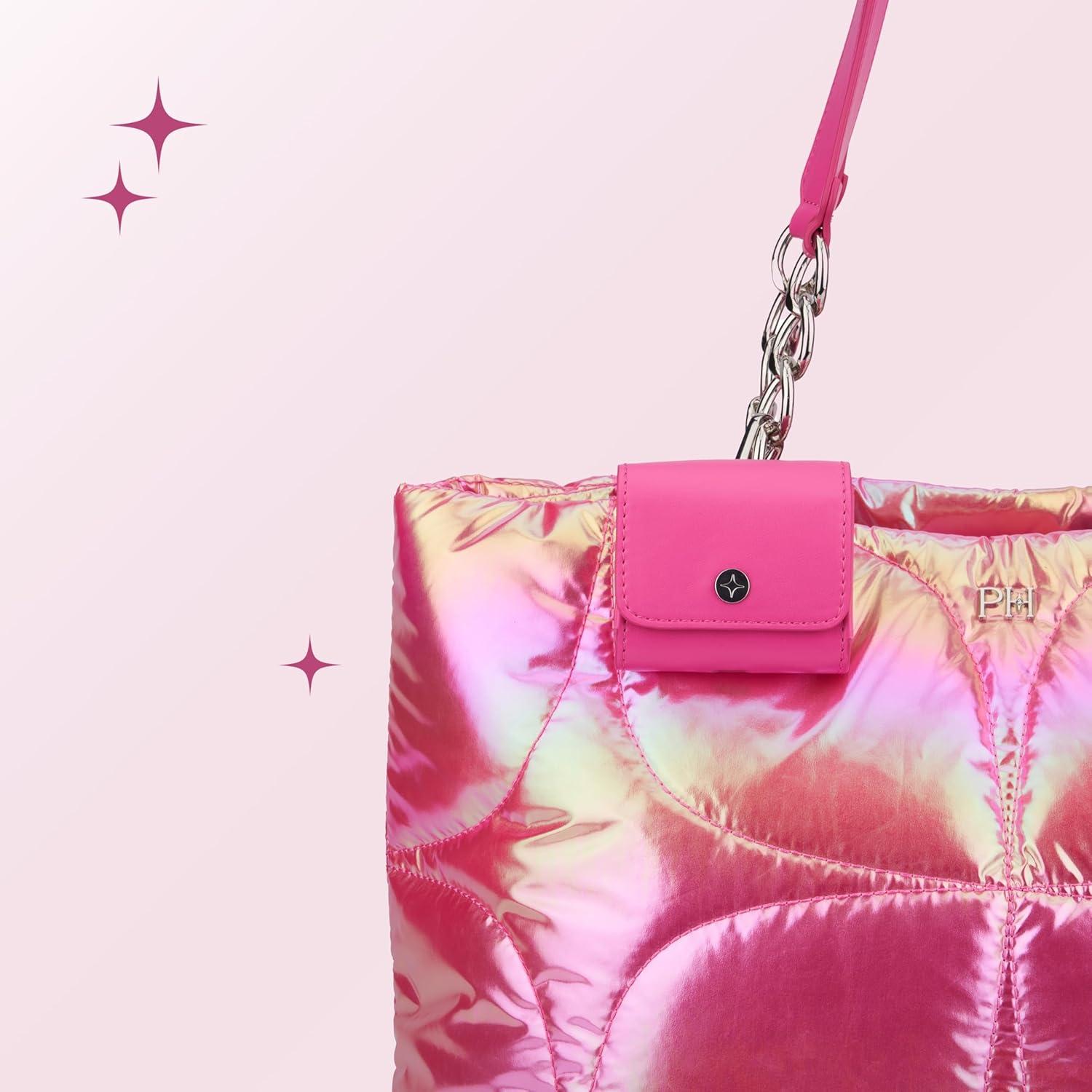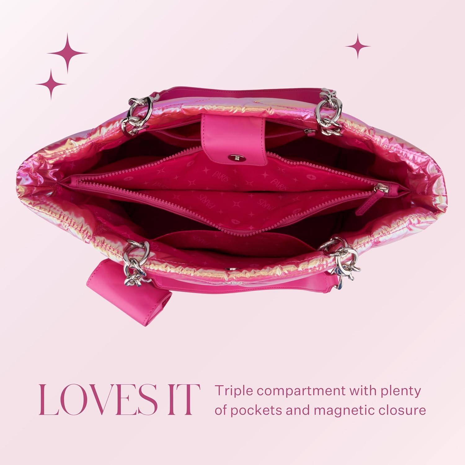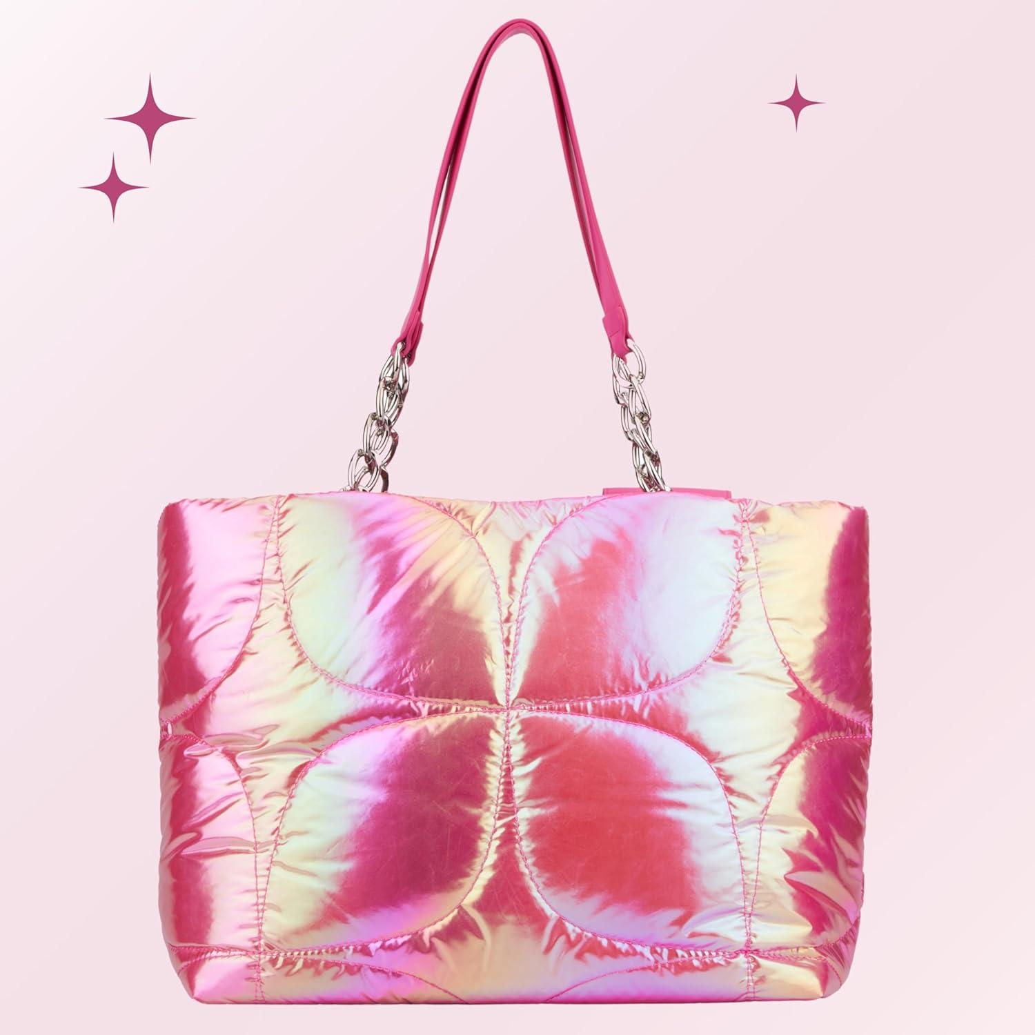 Shine on with the oversized iridescent tote bag by Paris Hilton. Made with super shiny quilted metallic nylon, this oversized bag is both glam and functional. Easily fit books or a laptop in the roomie triple comparment interior and of course the essentials – phone, keys, and wallet. Plus, don't forget about the mini detachable pouch, perfect for storing headphones.