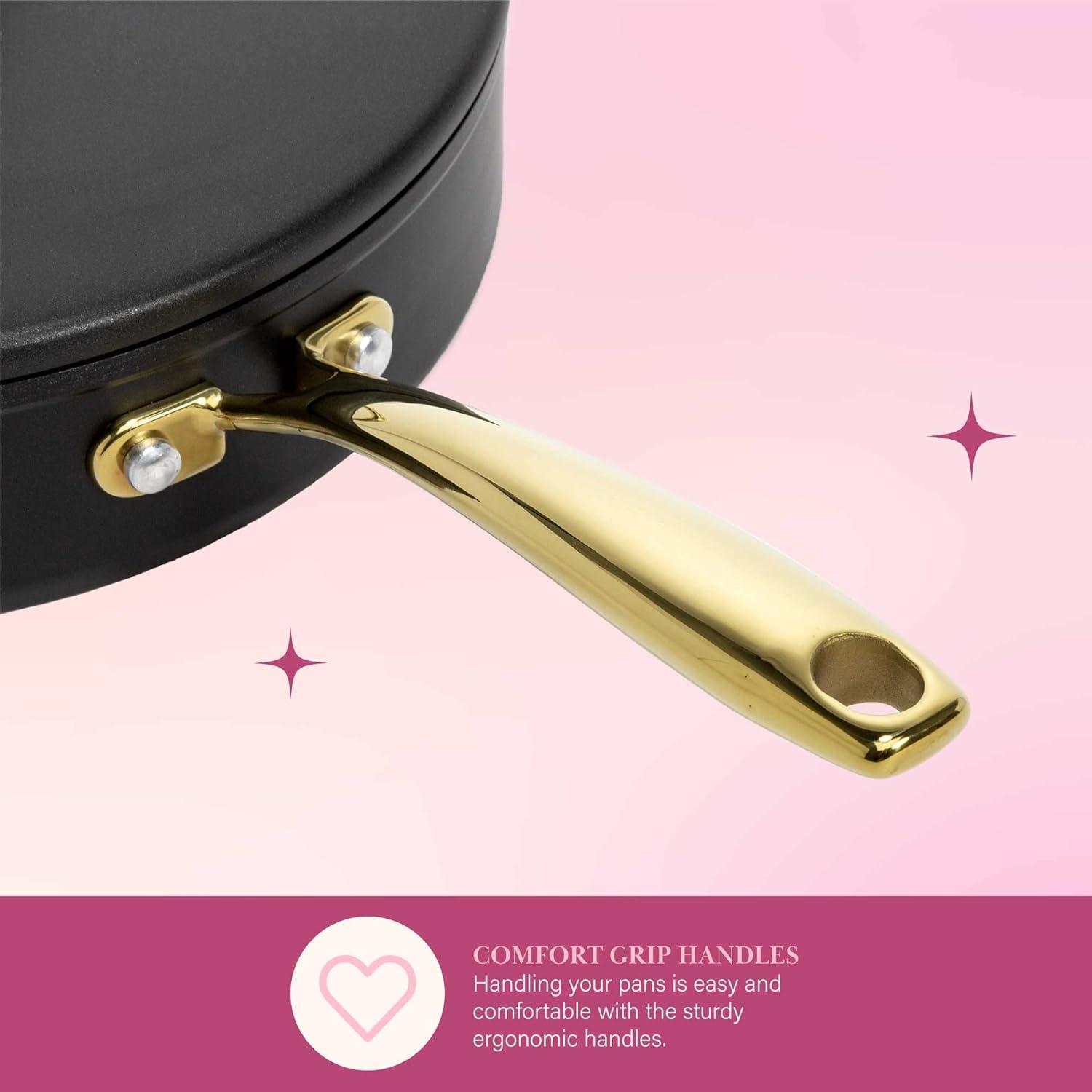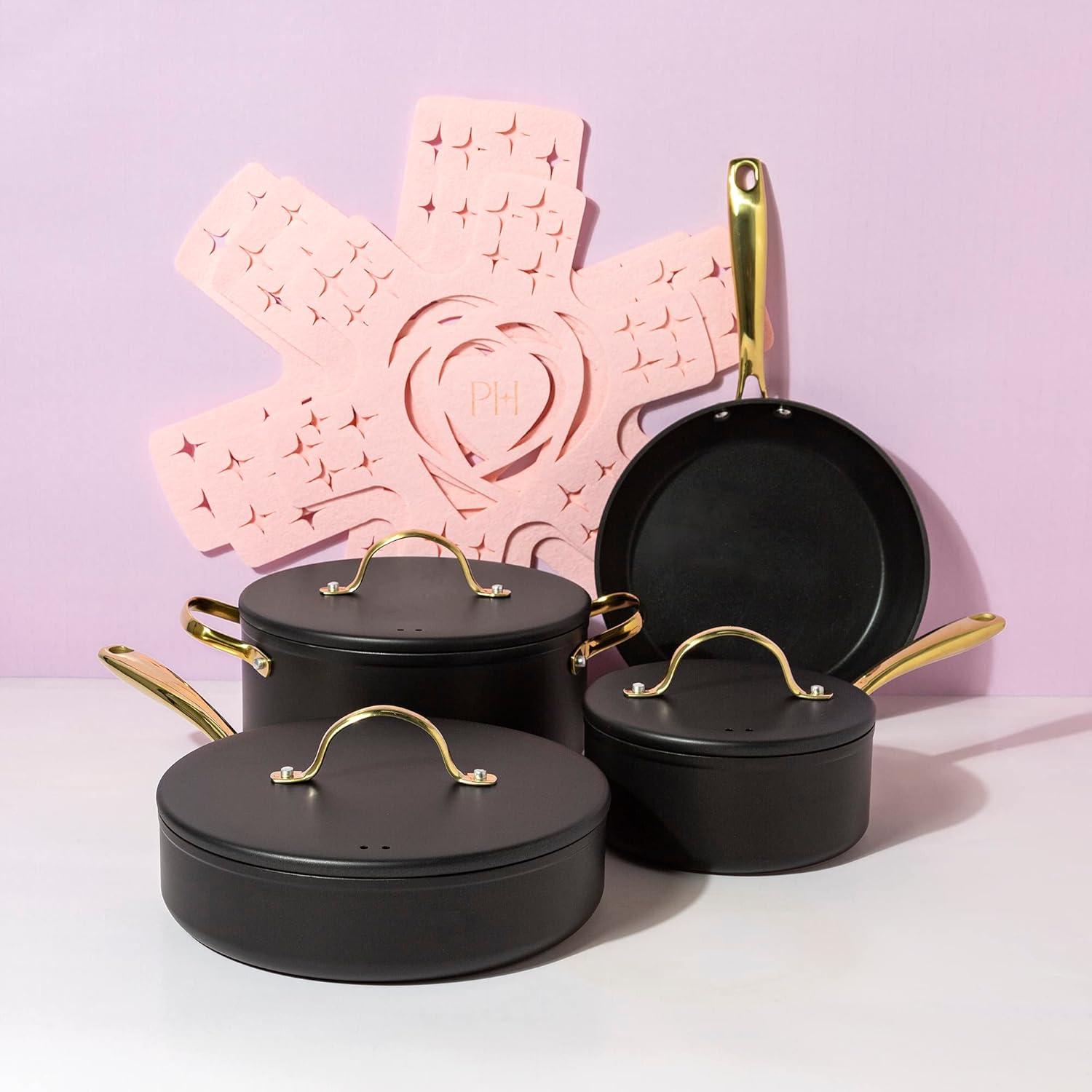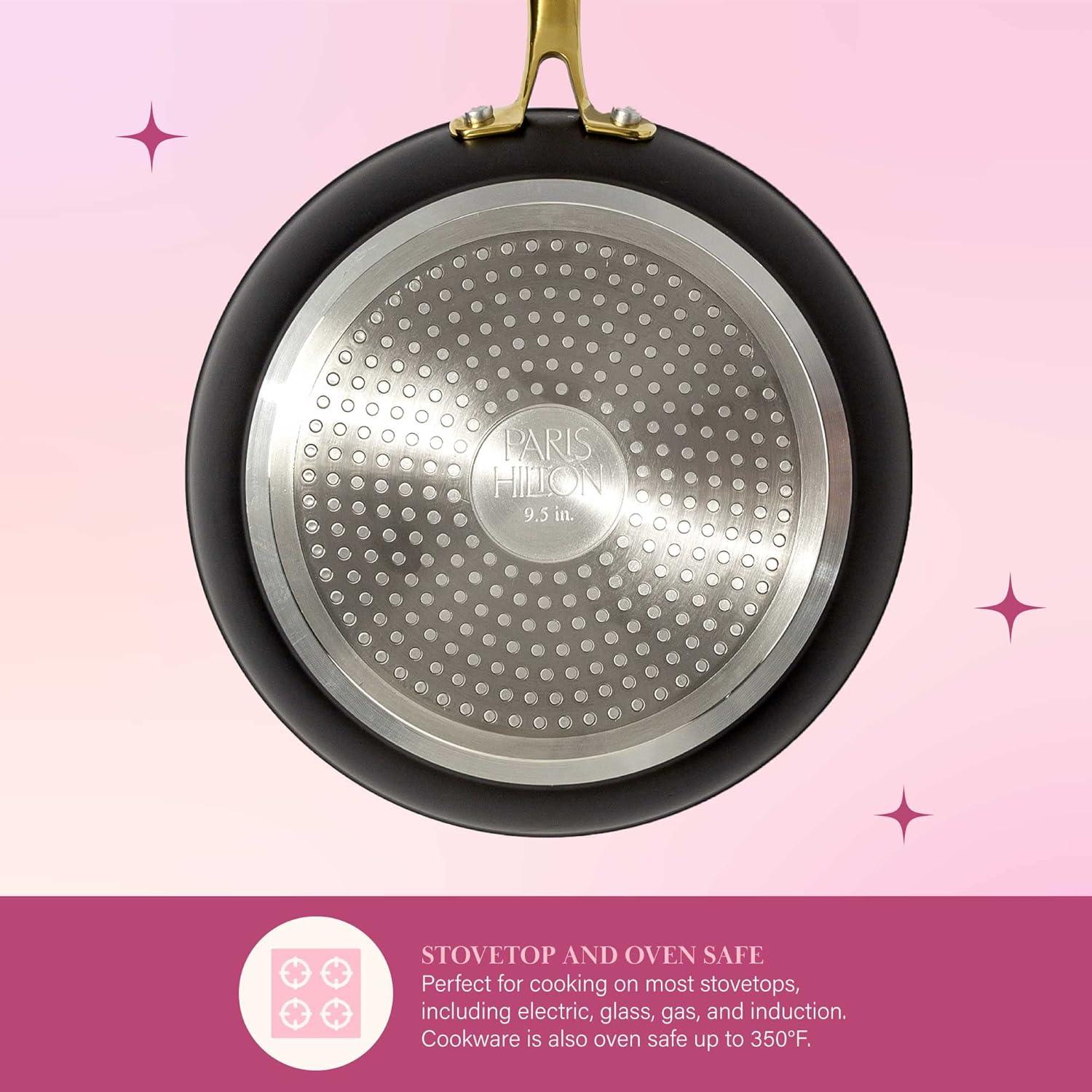 Paris Hilton Iconic Nonstick Pots and Pans Set, Multi-layer Nonstick Coating, Matching Lids With Gold Handles, Made without PFOA, Dishwasher Safe Cookware Set, 10-Piece, Pink(Black)