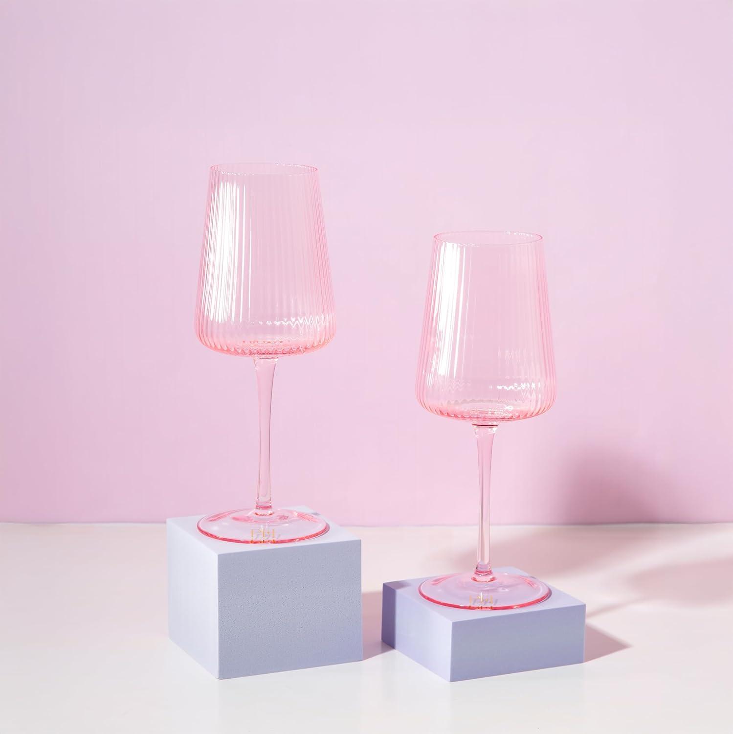 Paris Hilton Ribbed Wine Glass Set, Elegant Fluted Glassware, Perfect for Red Wine or White Wine, Set of 2, 18-Ounce, Pink(Wine Glass)