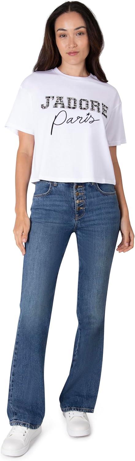 Paris Hilton Women’s Fashion T-Shirt Embellished Graphics Short Sleeve Crew Neck Tops(Jadore White)
